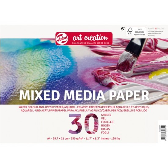 Blok Mix media Talens Art Creation, vsebuje 250 g papir, 30 pol, s spiralno vezavo. Namenjen raznovrstnim tehnikam, akril, akvarel, olje, kolažim, markerji, suha risala..