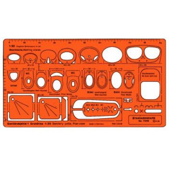 Arhitekturna profi šablona, proizvajalca Standardgraph iz transparentno oranžnega materiala, v razmerju 1:20. Na šabloni je natisnjena gradacija za lažje načrtovanje.