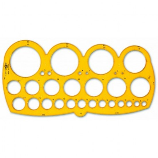 Arhitekturna profi šablona iz transparentno oranžnega materiala, s simboli krogov od 1 do 35 mm za lažje tehnično risanje.
