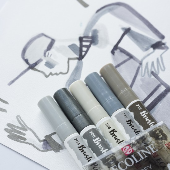 Ecoline brushpens so pisala z izjemno prožno čopič konico, polnjena s tekočim akvarelom Ecoline. Kolekcija ponuja 60 intenzivnih, sijočih odtenkov, ki se med seboj dobro mešajo in omogočajo lahkotne prelive. Po sušenju barvni nanos ni vodoodporen zato ga z mokrim čopičem ponovno aktiviramo in nadaljujemo delo. Ecoline akvarelni čopič je odlična izbira za ilustratorje, grafike, notranji in industrijski dizajn, hobi in crfat umetnike, akvareliste, za kaligrafsko ustvarjanje in celo za otroške roke.