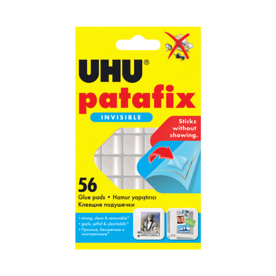 Lepilne blazinice Patafix, prozorne barve, so primerne za čisto in čisto pritrjevanje manjših predmetov, kot so fotografije, risbe, razglednice in posterji na številne površine kot npr. vrata, okna ali pohištvo. Blazinice so prosojne na steklenih površinah in za prosojnimi predmeti. Iz večine gladkih površin jih lahko odstranimo brez madežev. Idealno za izdelavo kolažev, nalepk za na okna, voščilnic in foto albumov.