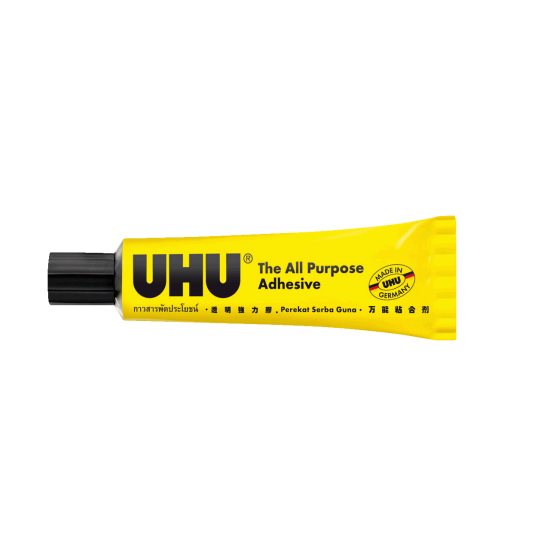 Univerzalno tekoče lepilo UHU, je brezbarvno lepilo za lepljenje vseh vrst materialov na les, karton, papir, tekstil, usnje, keramiko, porcelan, steklo, kovino, klobučevino, pluto. Ni primerno za lepljenje stiropora. V tankem sloju nanesite na čisto, suho in razmaščeno površino ter takoj stisnite skupaj.